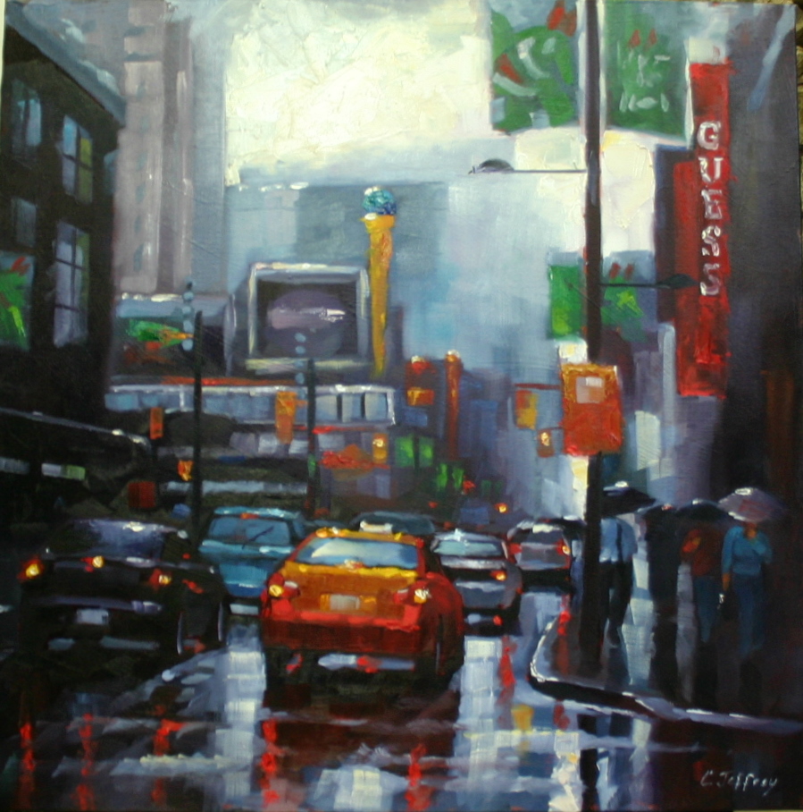 The atmospheres and scenes that I choose to paint require the use of gray tones. I have been creating grays using different mixes. For this painting I used ultramarine blue mixed with transparent iron oxide for the main color scheme, and added white, cadmium red, and yellow ochre for highlights.